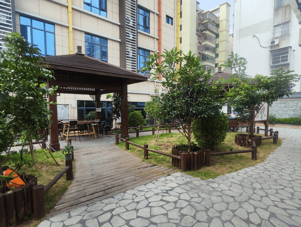 居住空间上,三至五层全托居住区,房间布置温馨,家具选型注重适老化,为长者营造家的氛围。公共区域中,一层康复训练室配备先进康复设备,助餐食堂宽敞明亮;二层文化活动区与日间照料中心,为长者提供交流娱乐空间;室外300平方米空中花园,无障碍步道、防滑地砖与休憩凉亭一应俱全,让长者亲近自然。所有公共区域安装双层扶手,卫生间配备助力座椅与紧急按钮,电梯采用大字号楼层显示与慢速运行模式,处处体现适老化设计理念。智慧系统方面,线上通过高德、百度地图APP实现实时导航;线下在黄石东路沿线设置3处醒目路牌,院区入口处配备遮阳棚与无障碍通道;人工服务安排专人值守咨询热线,提供步行引导服务。