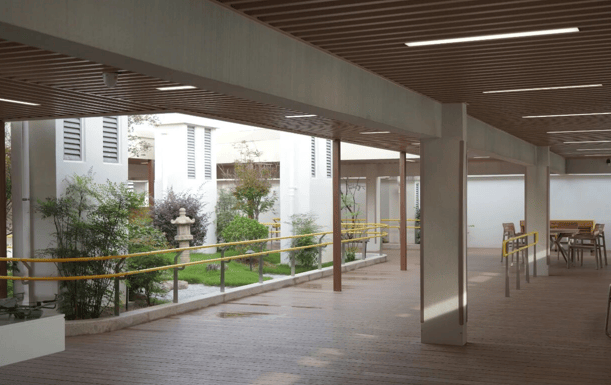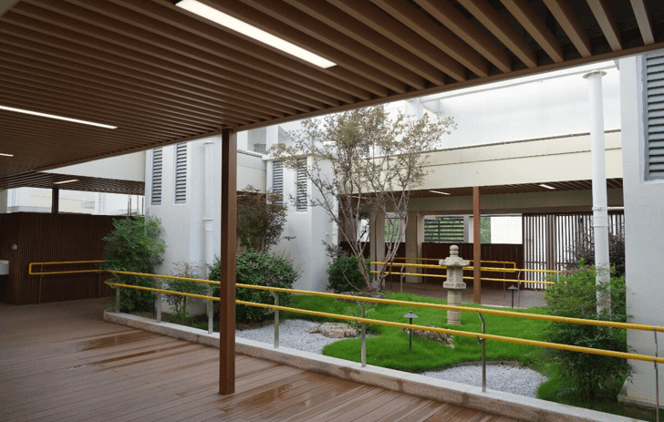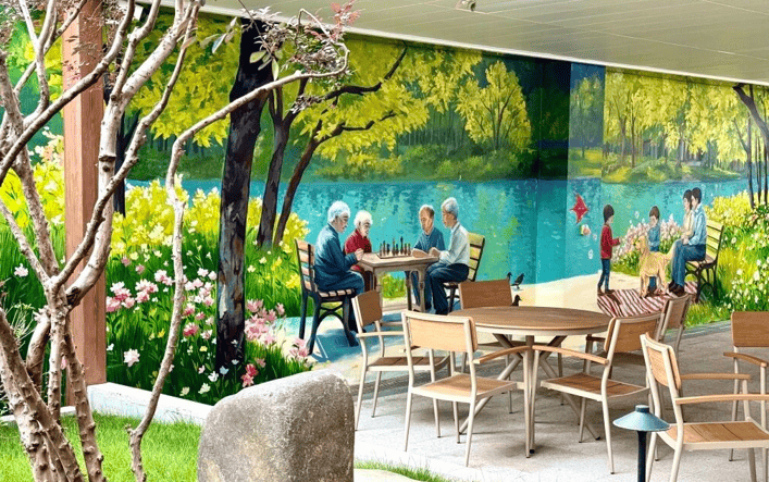 生态设施:中央花园的环形健康步道采用防滑材质,结合四季植物配置,适合晨练与散步;屋顶花园恒温泳池水温恒定在28℃,配备专业救生员,满足长者全年游泳需求;药草种植园种植广藿香、陈皮等岭南道地药材,长者可参与种植与采摘,体验中医养生文化。