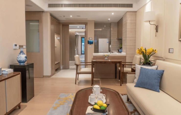 广州富力颐安养老社区总建筑面积7.36万平方米,规划有两栋颐养公寓与一栋综合服务中心,提供438套活力养老单元,房型涵盖单人间、双人间、一房一厅及两房一厅等多种类型,满足不同长者的居住偏好。所有房间均采用全适老化设计,配备圆角防撞家具、防滑地胶、智能温控系统及空气净化装置,卫浴空间设置L型扶手、恒温花洒与折叠助浴椅,全方位保障长者居住安全与舒适。