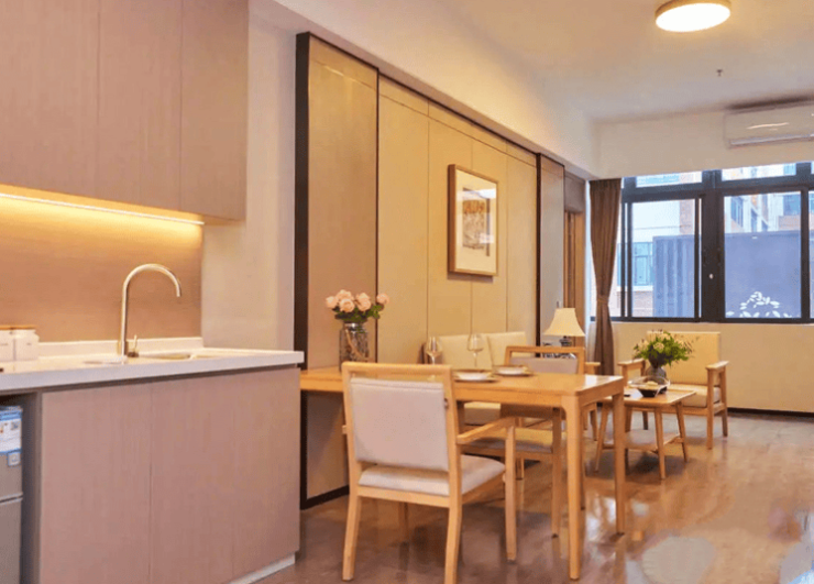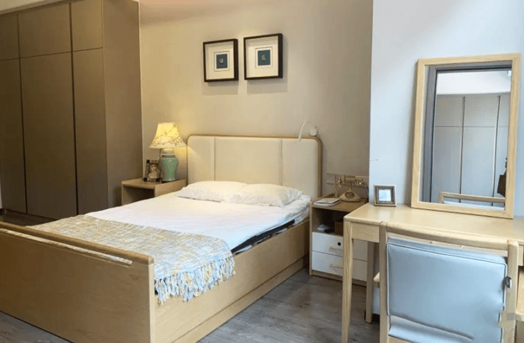 公寓突破传统养老机构的空间局限,推出三大房型体系:30-45㎡的单人间配备智能床垫与无障碍淋浴系统,适合独立生活长者;45-60㎡双人间设置1.2米护理床间距,满足半失能需求;60-120㎡套房增设适老化厨房与观景阳台,支持家属短期陪护。全屋采用防滑地胶、圆角家具、紧急呼叫系统,厨房区配置电磁炉灶台与防烫插座,智能家居系统实现全屋WiFi覆盖与护理床高度调节,形成从活力养老到认知症照护的全场景覆盖。