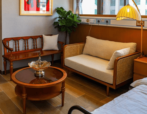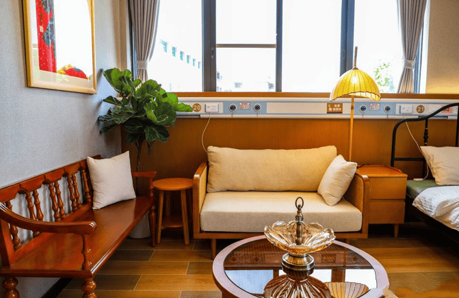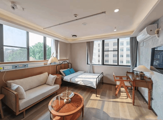 为满足不同长者居住偏好,登峰园提供丰富房型选择。单人间面积25 - 35平方米,独立卫浴、智能护理床、毫米波雷达跌倒监测系统及氧气接口一应俱全,适合失能或追求私密性的长者;双人间面积20 - 28平方米,分区储物柜与隔音玻璃隔断设计,床间距≥1.2米,性价比高,适合半自理长者;多人间经济实惠,床位费低至3000元/月,含基础生活照料及集体文娱活动,满足不同经济状况长者的需求。