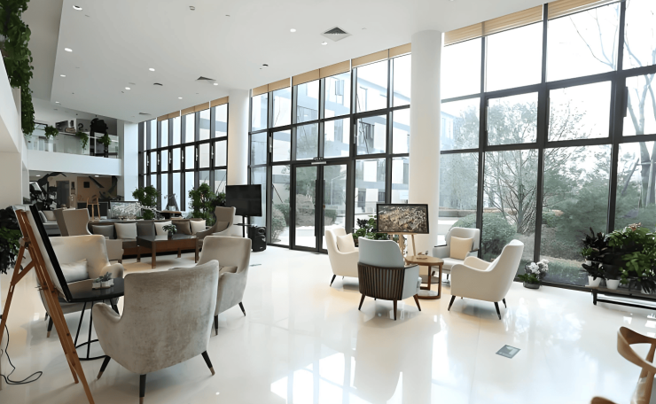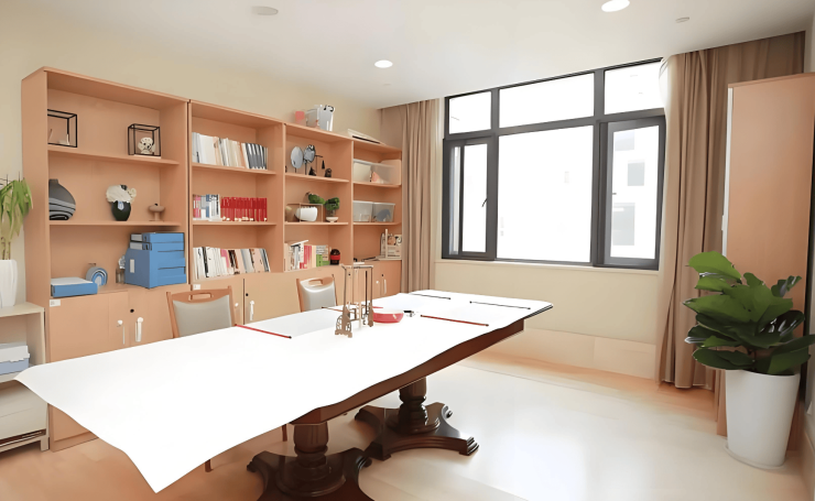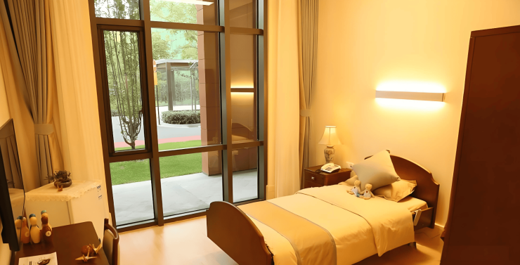 总建筑面积近5万平方米,规划床位406张,涵盖单人间、双人间、家庭套房及认知症专护区。居住单元采用“安全无障碍、自然可感知”设计:单人间28-45㎡配备独立卫浴、智能护理床及毫米波雷达跌倒监测系统;双人间35-50㎡采用分床设计保障隐私;家庭套房60-100㎡含独立客厅与温泉入户。公共区域整合5000㎡中央花园、2000㎡生态庭院及屋顶花园,种植银杏、玉兰等本地树种,四季有景;屋顶花园设置园艺治疗区,配置触觉雕塑与声景装置。建筑采用“回”字形布局,走廊宽度1.8米并配备连续扶手,地面铺设防滑系数≥0.95的PVC地胶,卫生间“零高差”设计搭配L型扶手,实现无障碍通行。