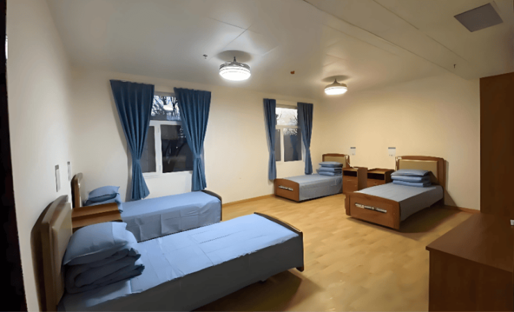 总建筑面积2700平方米,规划床位115张,涵盖单人间(25-35㎡)、双人间(40㎡)及多人间(35-45㎡)。单人间配备独立卫浴、智能护理床及毫米波雷达跌倒监测系统;双人间增设USB充电口与衣物消毒柜;多人间配置共享阅读角。公共区域整合2000㎡康复中心、800㎡屋顶花园及多功能厅,医疗层配备DR数字影像系统与全自动生化分析仪,支持医保实时结算。全院采用“医养融合”功能分区,包括医务室、康复理疗中心、书画室、陶艺工坊及500㎡阳光餐厅。