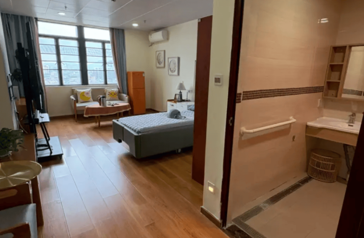 根据长者居住需求,规划有单人间、双人间及VIP套房三类房型。单人间面积35-45平方米,配备独立卫浴、智能护理床及负离子空气净化器;双人间面积25-30平方米,采用隔音玻璃隔断与分区储物柜,保障隐私与收纳需求;VIP套房面积60-80平方米,含独立客厅、厨房及观景阳台,支持家属短期陪护,各类房型均采光通透、配套齐全。