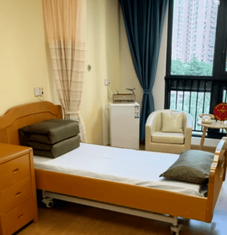 房间内部的每一处设计都紧扣安全与舒适两大核心,配备独立卫浴,保障长者洗漱便捷与私密;地面铺设专业防滑地胶,从源头减少跌倒风险;采用圆角家具设计,规避尖锐棱角带来的碰撞隐患;同时配备完善的紧急呼叫系统,床头安装的双向呼叫按钮更是将安全保障做到极致,一旦长者有需求或遭遇紧急情况,可第一时间发出呼叫信号,确保诉求得到快速响应。