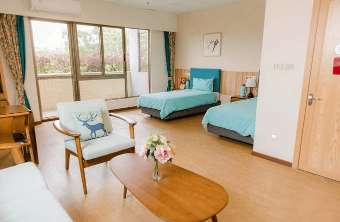 提供三种主力房型:28-35㎡单人间配备智能护理床、270°观景阳台与独立卫浴;35-40㎡双人间采用分床设计,共享会客区配置42寸智能电视;50-60㎡家庭套房含独立厨房与两处卫浴间,满足三代同堂短期居住需求。所有房间均安装智能呼叫系统,床头设置紧急按钮与夜读灯,卫生间配备助浴椅与防滑扶手,适老化细节渗透每个角落。