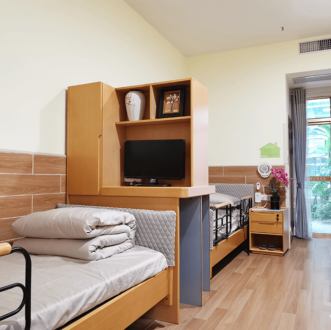 双人间面积25 - 45平方米,分床设计充分考虑了长者们的隐私需求。双控空调让长者们可以根据自己的喜好调节室内温度,营造舒适的居住环境。储物柜的设置,方便长者们存放自己的物品,使房间更加整洁有序。可调节护理床的设计,满足了不同长者的身体需求。床间距≥1.1米,保证了长者们有足够的活动空间,避免了相互干扰。
