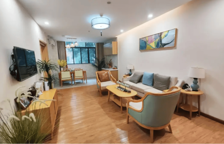 房型多样:提供单人间(30㎡)、双人间(32㎡)、一房一厅(60㎡)及两房一厅(97㎡)四种户型,均按居家标准配置电视、沙发、空调等家具电器,并融入适老化设计: