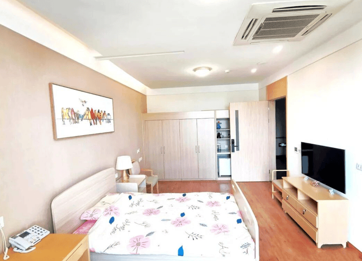 中心提供单人间、双人间及家庭套房三大类房型,满足不同长者的居住需求。单人间面积30—45平方米,配备多种适老化设备,适合追求隐私的长者;双人间面积40—60平方米,兼顾性价比与社交需求;家庭套房面积80—120平方米,含独立智能厨房与客厅,适合家属陪护或短期居住。所有房间均采用圆角防撞设计、感应夜灯等,确保长者居住安全与舒适。