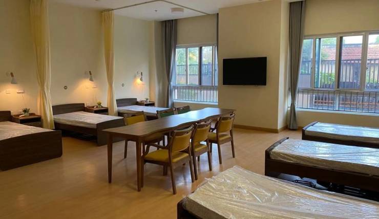 房间配备防滑地板、紧急呼叫系统及空调,公共区域设康复理疗室、阅览室;医疗团队由全科医生、护士及康复师组成,提供慢性病管理、术后康复服务,并与周边三甲医院建立绿色通道。