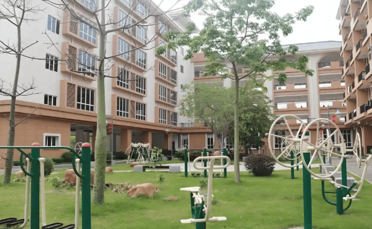 院区依山而建,绿化覆盖率超45%,中央景观轴串联主题园区,种植多种岭南药用植物,营造出四季常绿的生态环境。居住空间提供单人间、双人间、四人间三类房型,单人间面积25-30平方米,双人间18-22平方米,四人间12-15平方米,均配备独立洗手间、冷暖空调、24小时热水及定制家具。全屋采用适老化改造,走廊设置双层扶手,地面铺设防滑地胶,电梯配备低位按钮,公共区域采用防眩光照明,床头设置紧急呼叫装置,全方位保障长者居住安全与舒适。