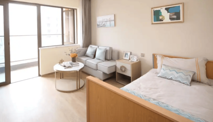 提供38—120㎡多种户型,全屋采用日本进口适老化家具,如可升降护理床、带扶手餐桌、圆角防撞柜体,轮椅回转空间≥1.5米。房间内配备毫米波雷达跌倒监测仪、智能手环、防走失定位手环,确保长者安全。针对重度认知症长者,提供防走失定位胸牌,结合电子围栏技术,确保活动范围安全可控。单人间配备智能护理床、毫米波雷达跌倒监测系统等适老化设施,月费8000元;双人间设共享客厅、独立储物柜及适老化厨房,月费6200元。