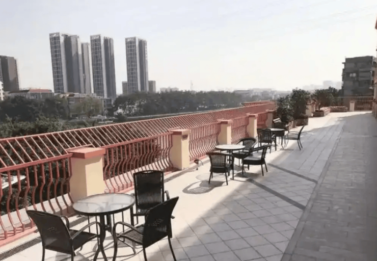护理院以“传统与现代共生”为设计理念,将青砖黛瓦、广绣、牙雕等非遗元素融入空间布局。四楼2000平方米的户外江景平台可供晨练观景,一楼喷水池与休闲座椅构成温馨社交空间,康复花园内绿植景观与适老化设施相映成趣。公共区域采用防滑系数≥0.85的PVC胶地面,走道宽度达1.8米,墙面安装适高扶手,全楼配置无障碍电梯与分体式空调系统。