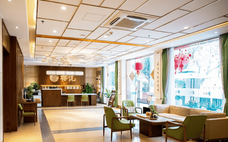 颐养院总建筑面积约5000平方米,前身为民国时期历史建筑,经专业修缮后保留了骑楼廊柱、满洲窗等岭南元素,同时植入现代适老设计。园区共8层,1-2层为公共生活区域,3-8层为居住区,顶层设有空中花园,形成立体的生活空间布局。整体以新中式风格为主调,搭配国画书法作品与岭南文化装饰,营造出典雅温润的居住氛围。