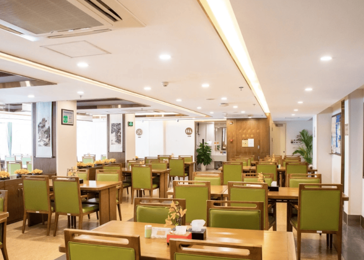 院内公共区域规划兼顾实用与人文关怀,涵盖1200平方米的多元活动空间。品茗茶室、书画交流区、多功能活动厅满足长者休闲社交需求,复刻西关茶楼场景的区域更添广府韵味。顶层空中花园铺设无障碍步道,种植岭南特色植物与道地药材,配备适老化健身器材,成为长者漫步赏景、舒展身心的静谧天地。各楼层均设有活动公区及小型配餐间,兼顾日常交流与取餐便利。