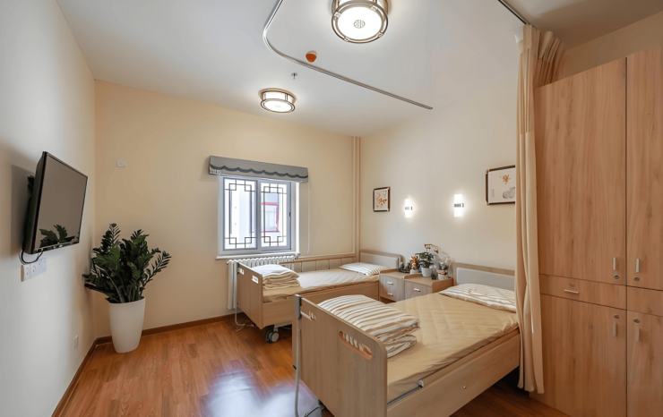 院内采用中式庭院风格,配备冬暖夏凉的阳光棚连廊,串联起各功能区域,提升居住舒适度。全院共37间房,含单人间9间(25-45㎡)、双人间28间(30-50㎡)及认知症专区。单人间配备独立卫浴、智能护理床及毫米波雷达跌倒监测仪;双人间采用对称式布局,中间设共享休闲区;认知症专区创新采用“记忆咖啡馆”模式,通过老物件唤醒情感记忆。所有房间均配备实木适老化家具、独立卫浴及生命体征监测系统,兼顾私密性与安全性。