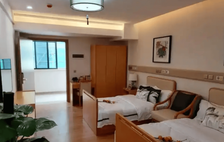 园区占地约100亩,依托高校10万平方米生态园林,负氧离子浓度远超城市平均水平,获评“广州市森林康养基地试点单位”。居住空间涵盖30㎡单人间、32㎡双人间至98㎡两房一厅等多种户型,采用南北通透的E字型布局,户户见景。全屋配备防滑地胶、圆角家具、感应夜灯等适老设施,床头紧急呼叫系统与毫米波雷达跌倒监测系统形成24小时安全守护,兼顾居住安全与温馨质感。