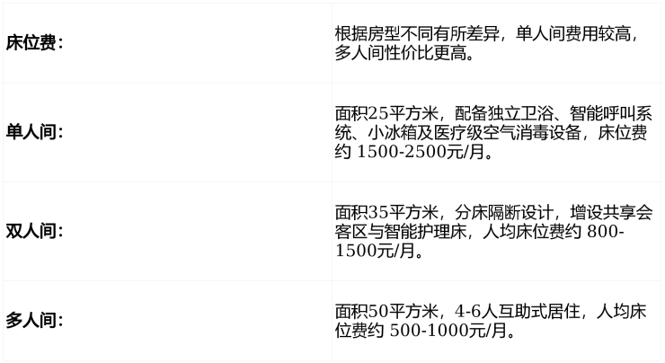 高品质选择(5500-6500元/月):提供个性化专业照护,适合完全失能或认知症老人,选择单人间并搭配重度护理服务。