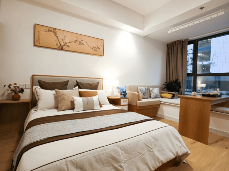 项目总建筑面积17.7万平方米,分两期建设,规划床位2200张。一期已投用561间康养公寓、二级康复医院“玉兰医院”及下沉式商业广场,二期预计2027年竣工。采用“核心筒+辐射状”布局,85%为南向户型,层高达3.2米。居住单元涵盖52-105㎡五大户型,单人间配备智能护理床、毫米波雷达跌倒预警系统及独立卫浴;双人间采用分床独立控制系统;认知症专区配置怀旧物件墙与防走失系统。公共区域配置恒温泳池、图书馆、玉兰剧场等12大功能空间,实现“15分钟生活圈”全覆盖。