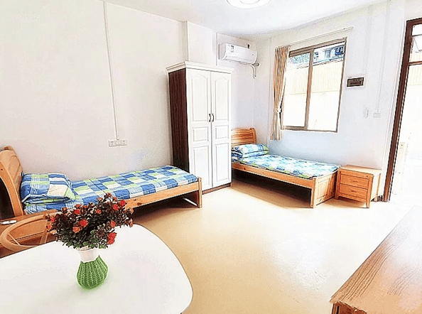 双人间(舒适型)面积25-35平方米,通过分区储物柜实现物品有序存放,共享会客区促进社交互动。中央空调系统保持恒温恒湿,新风系统24小时循环净化空气。每间房配备智能照明系统,可根据昼夜自动调节亮度,营造舒适居住环境。