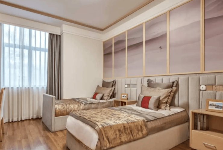 院内提供单人间、双人间及套房等多种房型选择,面积从25平方米至120平方米不等,适配不同居住偏好。所有房间均采用适老化细节设计,配备圆角家具、防眩光照明系统与可调节护理床,卫浴区设置恒温淋浴系统、智能马桶及安全扶手,床头与卫生间配置紧急呼叫系统及毫米波雷达跌倒监测装置,走廊安装双层扶手与智能感应夜灯,全方位降低安全风险。