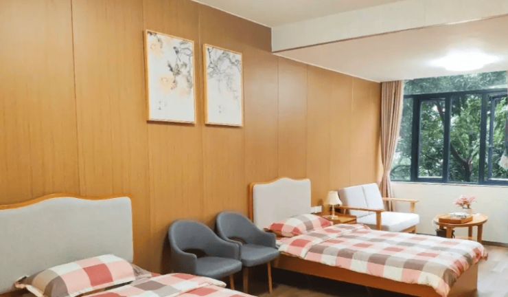 适老化细节极致:全院采用“双通道”设计,轮椅使用者与护理人员通行互不干扰;房间内感应夜灯、防滑地胶及适老化家具覆盖率达100%,地面防滑系数达国际R10级标准,走廊扶手间距严格遵循人体工学60—65cm规范。单人间增设独立新风系统与药品冷藏格,双人间床间距达1.8米,套房配备独立客厅与观景阳台。